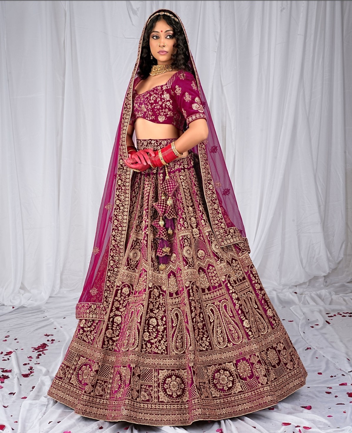 This wine color velvet fabric lehenga is